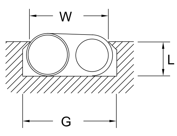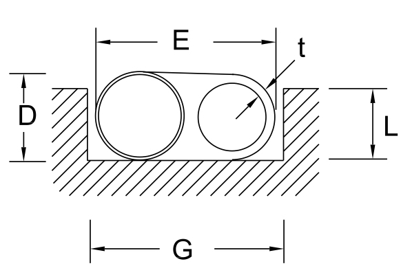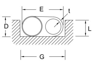 | Width of Gasket (E) | Spiral Diameter (D) | Thickness of Wall (t) | Standard Force* | Moderate Force | Low Force | Depth (L) +.002”-.000” | Width (G) +.007”-.005” | Width (W) +.000”-.002” |
